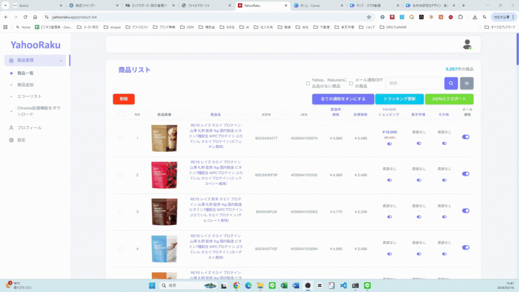 Chrome拡張機能をご用意しております。ヤフーショッピング、楽天市場の商品ページから個別登録が可能になります。(JANコードを登録している商品のみ対応)