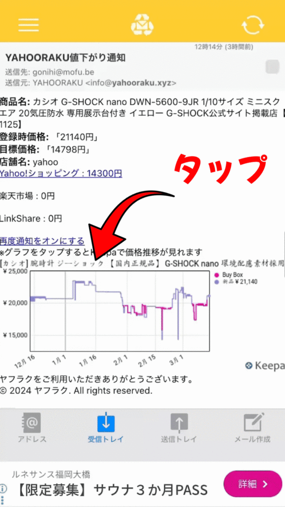 メールに表示しているKeepaグラフをタップすることでKeepa商品ページへ移動します